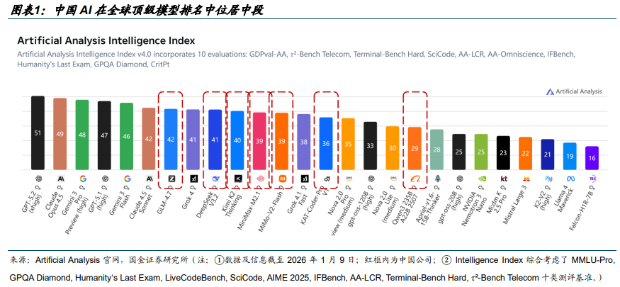 1)中国 AI 全球存在感大幅提升,国内大模型迭代不断。据 AA,尽管 GPT-5.2 与 Gemini 3 Pro 仍占据塔尖,但中国国产模型已有效改变了北美单极主导的竞争格局。在全球 Top 10 阵营中,GLM-4.7、DeepSeek V3.2、 Kimi K2 Thinking 已占据 3 席;若将观测范围扩大至 Top 15,中国企业席位达 6 个,2025 年中国开源 AI 模型调用量约占全球市场的 70 %。2)推理需求激增:o1 类推理模型的出现,使推理阶段的计算量(Inference-time Compute)相对传统模型解锁了约 10 倍的潜力,算力需求已从单一的“训练驱动”转向“训练 推理双轮驱动”。3)流量入口重塑:入口不再仅限于手机,而是演变为“OS 级智能体”与“超级 APP“层面较量。2025 年 12 月 24 日,字节跳动旗下 AI 应用豆包宣布日均活跃用户数(DAU)突破 1 亿;千问 App 近期持续扩大投流,截止 12 月 10 日(公测 23天)月活已突破 3000 万,下成全球增长最快 AI 应用。豆包绕开传统接口,用“看屏幕 代操作”的方式在现有生态之上再搭一层“AI 操作系统”,AIOS 直接触碰微信、支付宝等超级 App 的商业命门,传统 App 时代的游戏规则面临挑战,微信、淘宝等超级 App 陆续封禁豆包手机权限。在此背景下,我们认为入口之争的背后是流量之争,直接指向大型互联网企业广告及电商业务的基本盘,2026 年各家在模型、AI 应用产品上的算力投入将进入白热化的锦标赛阶段。