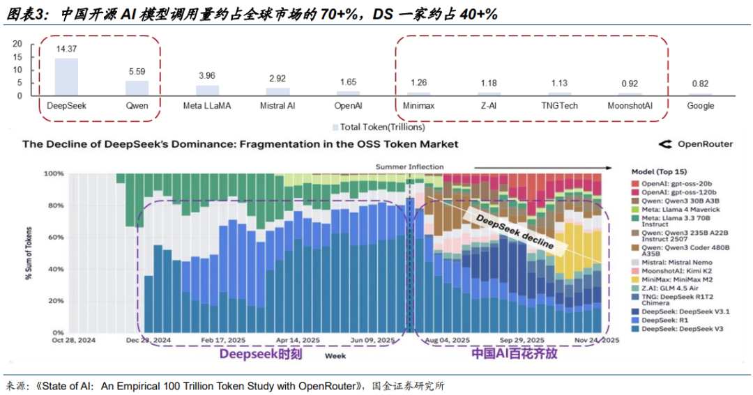 2025 年中国开源 AI 模型调用量约占全球市场的 70 %。据《State of AI:An Empirical 100 Trillion Token Study with OpenRouter》,DeepSeek 与 Qwen 分别以 14.37 万亿及5.59 万亿 Token 消耗量领跑开源市场,这一数据远超同口径下 OpenAI(1.65 万亿)与Google(0.82 万亿)的表现。去年 8 月份之后,国产开源模型厂商竞相繁荣,驱动中国厂商整体份额稳中有进,合计占据了全球超过 70%的开源份额。