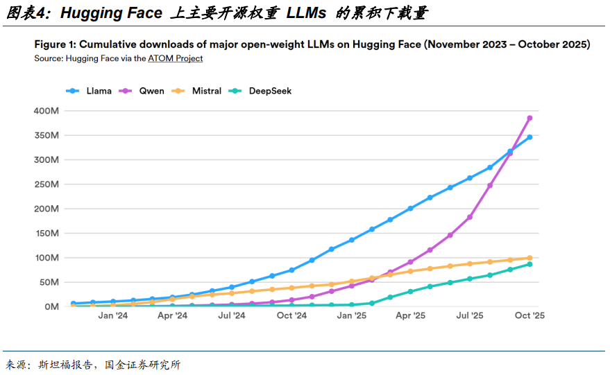 2025 年 9 月,阿里巴巴的 Qwen 模型家族超越 Llama,成为 Hugging Face 上下载量最多的 LLM 家族。2024 年 8 月至 2025 年 8 月期间,中国开源模型开发者占 Hugging Face 所有下载量的 17.1%,略超过美国开发者,后者占下载量的 15.8%。自 2025 年 1 月起,基于阿里巴巴和 DeepSeek 发布的开源模型的上传衍生模型已超过基于美国和欧洲主要模型的衍生模型。并且在 2025 年 9 月,中国微调或衍生模型占 Hugging Face 上发布的所有新微调或衍生模型的 63%。