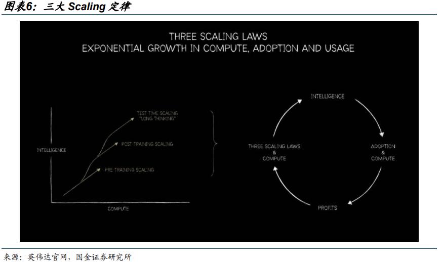 大模型三大 Scaling 定律:预训练(pre-training)/后训练(post-training)/推理深度思考(test-time long thinking)。算力与应用循环促进: 算力 Scaling—>智能提升(Intelligence)—>应用的广泛采用(Adoption)—>经济效益(Profits)—>算力 Scaling。GPTo1 之后,模型 Scaling law 从单一的预训练(pre-training)向三大 Scaling 转变。1)模型在回应用户之前产生很长的内部思考链,思考时间越长,答案的质量就越高;2)Multi-agent 进一步提升模型性能,但其Token 消耗量往往达到对话聊天的数倍。