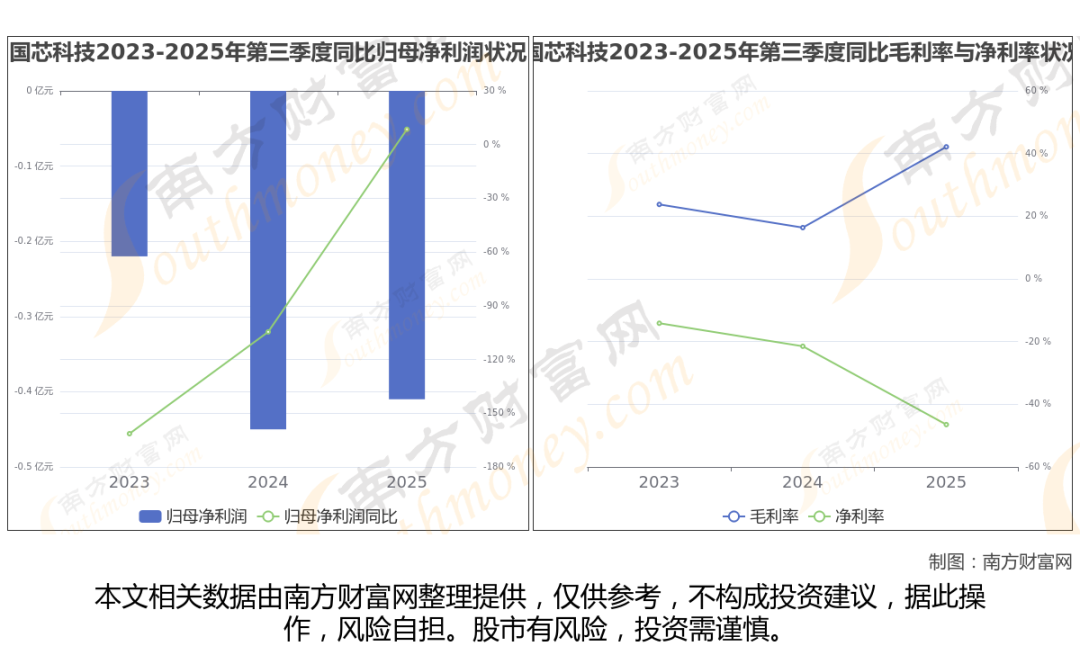 2025年第三季度季报显示,国芯科技公司实现净利润-4092.84万,同比上年增长率为8.53%,毛利率42.14%。