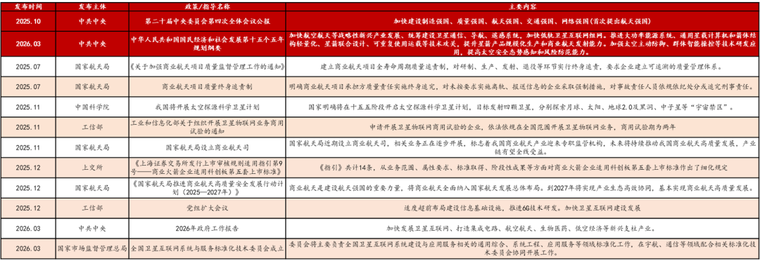 26年两会商业航天战略地位进一步提升,将建设千亿-万亿级重大项目。2026年政府工作报告指出,要打造集成电路、航空航天、生物医药、低空经济等新兴支柱产业,并且首次单独表示将加快发展卫星互联网,商业航天战略地位进一步提升。并且发改委主任郑栅洁表示国家将在卫星互联网等领域,建设投资规模均为千亿级甚至万亿级的一批长链条、大体量的重大项目。十五五规划明确加快低轨卫星互联网组网,在能源系统、星载计算机、可回收火箭、太空防御等重点方向加速布局,且十五五重大工程项目涵盖商业航天、深空探索、卫星互联网等领域。商业航天将于十五五阶段迎来重大发展机遇,后续有望持续得到国家从政策&资金方向的支持,政策密集期&产业加速期已至。
