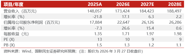 公司煤炭主业具备内外部延展性,叠加高长协特点保障盈利稳步提升;且煤化一体的协同模式有助于提高估值。我们预计2026~2028年公司将实现归母净利润226.47/261.26/262.86亿元,对应EPS分别为1.71/1.97/1.98元/股,对应2026年3月27日收盘价的PE分别为10/9/9倍,维持“推荐”评级。