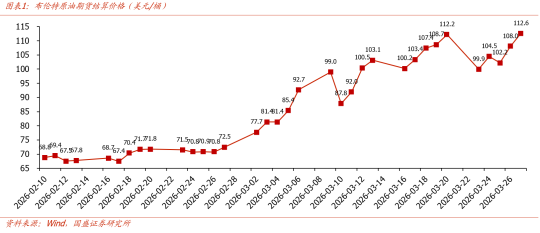 战争扩大导致霍尔木兹海峡持续封锁,全球能源危机加剧。截至3月下旬,约2000艘船只和2万名海员滞留于海峡两端。伊朗伊斯兰革命卫队明确警告,任何与美国及以色列关联的船只均将被视为合法目标,IRGC发言人宣称"不会让一升石油通过海峡"。霍尔木兹海峡封锁背景下,油价持续攀升,布伦特原油期货结算价格从冲突前的约72美元/桶飙升至3月27日收盘的113美元/桶,涨幅55%。截至3月中旬,海湾地区合计减产规模已达到至少1000万桶/日,是全球石油市场历史上最大规模的供给中断。在战争扩大化趋势下,预计霍尔木兹海峡封锁将延续,加剧全球能源危机。