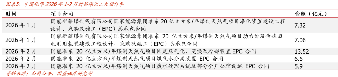 煤化工:政策推动景气上行,投资建设有望加快落地。能源自主可控需求下,煤制油、煤制气等现代煤化工作为提高能源自给率的重要抓手,后续政策支持力度有望加码。同时,近期油价上涨显著增强煤化工路线相对石油化工路线的成本竞争力,盈利预期改善有利于提振煤化工业主自身投资扩产意愿。政策支持叠加盈利预期改善增强投资落地确定性,项目推进节奏有望明显加快,后续订单有望加速释放。此外,部分煤化工EPC龙头拥有化工实业布局,在全球地缘冲突 供需格局改善 反内卷等因素影响下化工品价格有望上涨,带动实业板块利润弹性释放。重点推荐双重受益煤化工景气上行与化工品价格上涨的煤化工EPC龙头中国化学、三维化学、东华科技等。其中中国化学2025Q4业绩加速增长,近期落地多个新疆煤化工EPC大单:公司2025年实现营业总收入1901亿元,同增2%;归母净利润64亿元,同增13%;Q4单季营收/业绩分别同增4%/19%,毛利率同比提升1.2pct带动业绩提速增长。2026年年初以来新签国能准东20亿立方米/年煤制天然气项目多个核心装置EPC,后续煤化工领域订单有望持续放量。