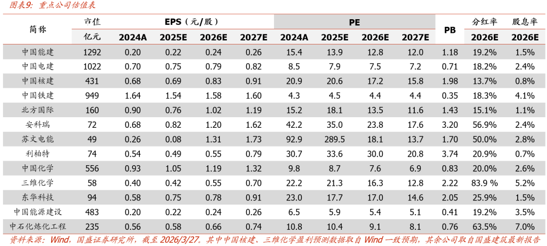 伊朗与美以冲突烈度持续攀升,战争扩大化风险加大,霍尔木兹海峡持续封锁,全球能源危机加剧,能源自主可控战略重要性进一步凸显,继续重点推荐三大投资方向:1)煤化工:煤制油、煤制气等现代煤化工是提高能源自给率的重要抓手,投建有望加快,且实业化项目有望受益化工品涨价,重点推荐拥有实业的煤化工EPC龙头中国化学(26PE 7.6X)、三维化学(26PE 16X,股息率约5.2%)、东华科技(26PE 17X)。2)能源涨价:北方国际(26PE 14X)有望同时受益煤价/电价/战后重建”三重逻辑共振。3)新型电力系统及绿色能源:政策继续大力推动新型电力系统与绿色能源建设,有望为龙头带来丰富机遇,重点推荐和关注能效管理领军者安科瑞(26PE 24X),电力能源综合服务龙头中国能建(H股26PE 5X,PB 0.41X)与中国电建(26PE 7.5X,PB 0.71X);核电建设龙头中国核建(26PE 17X),核电模块化龙头利柏特(26PE 30X),稀缺配网一站式服务商苏文电能(26PE 18X)。