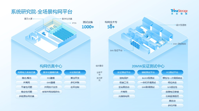 为应对电网挑战,天合储能以从电芯到系统全栈自研的构网型解决方案,为电网稳定提供系统级支撑。依托垂直一体化的系统集成能力,公司构建了涵盖先进储能电池、先进产品、电力电子、先进集成在内的全栈研发体系,以及构网仿真中心与20MW实证测试中心在内的全场景验证平台。目前,公司已累计获得600多项专利授权,参与20余项行业标准制定,为构网储能解决方案在多元复杂场景中的规模化应用奠定了坚实基础。