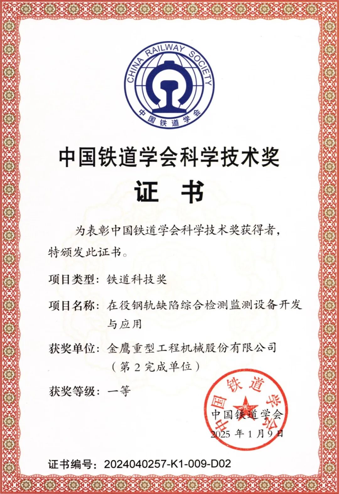 以该产品为成果的“在役钢轨缺陷综合检测监测设备开发与应用”项目荣获中国铁道学会科技一等奖。