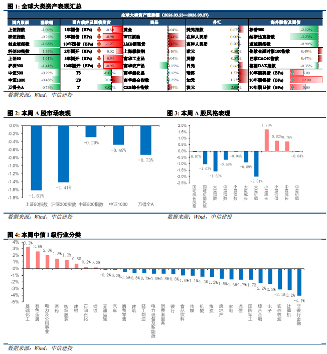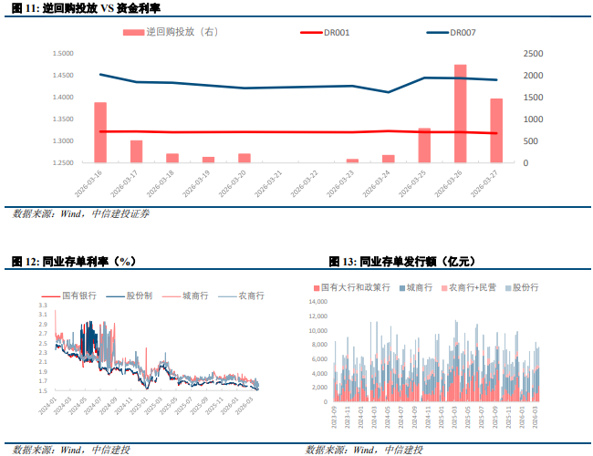 周一债市回调,超长端表现较好,周末美伊冲突升级,权益市场走弱,但是债市在流动性担忧下走势同样偏空,仅超长端表现较好。周二债市走势分化,超长端表现较好,隔夜特朗普表示美伊谈判进展较好,通胀担忧降温,长债利率小幅下行,盘后有报道称伊朗新任最高领袖同意与美国进行谈判,长端和超长端进一步下探。周三债市窄幅震荡,超长端表现较弱,债市盘初延续走暖,长债小幅下行,之后权益市场反弹,债市走弱。周四债市利率先下后上,盘前债市情绪较弱,权益市场开盘后持续走弱,且央行公开市场大额净投放呵护跨季资金面,各期限利率下行。尾盘债市止盈情绪发酵,各期限利率展开回调,超长端上行翻绿。周五债市走势分化,中短端表现较好,长端和超长端在权益市场走强的压制下走弱。