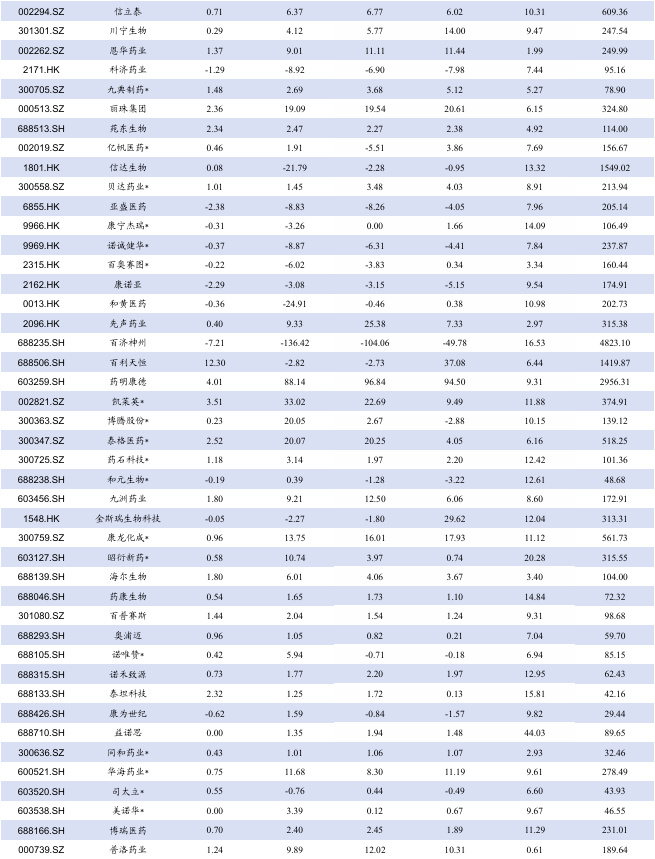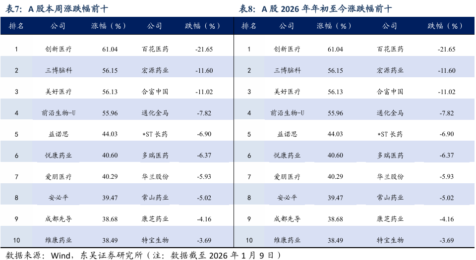 本周A股涨幅居前创新医疗( 61%)、三博脑科( 56%)、美好医疗( 56%),跌幅居前百花医药(-22%)、宏源药业(-12%)、合富中国(-11%)。本周H股涨幅居前劲方医药-B( 36%)、圣诺医药-B( 33%)、荣昌生物( 33%),跌幅居前拨康视云-B(-44%)、华昊中天医药-B(-33%)、华芢生物-B(-23%)。