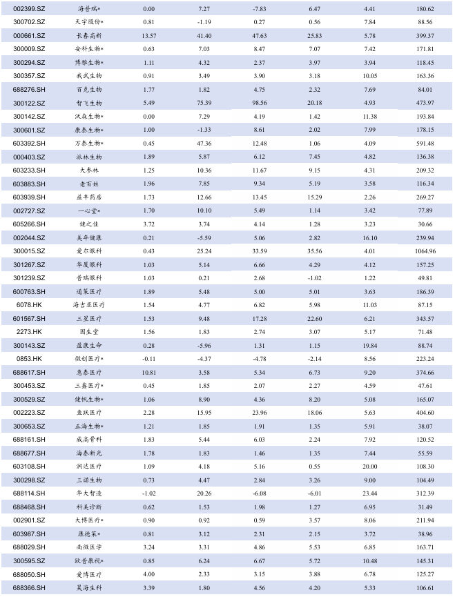 本周、年初至今A股医药指数涨幅分别为7.81%、7.81%,相对沪深300的超额收益分别为5.03%、5.03%;本周、年初至今恒生医疗保健指数涨跌幅分别为12.39%、12.39%,相对于恒生科技指数跑赢9.29%、9.29%;本周医疗服务( 12.34%)、医疗器械( 9.42%)、化学制剂( 7.17%)涨幅居前;本周无板块下跌;本周A股涨幅居前创新医疗( 61%)、三博脑科( 56%)、美好医疗( 56%),跌幅居前百花医药(-22%)、宏源药业(-12%)、合富中国(-11%)。本周H股涨幅居前劲方医药-B( 36%)、圣诺医药-B( 33%)、荣昌生物( 33%),跌幅居前拨康视云-B(-44%)、华昊中天医药-B(-33%)、华芢生物-B(-23%)。医药板块表现特点:本周医药板大幅上涨。