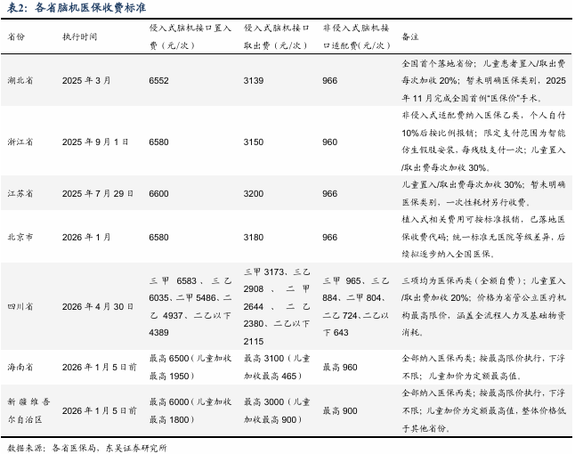 支付端:2025年3月,国家医保局印发《神经系统立项指南》,其中专门为脑机接口新技术价格单独立项,设立了“侵入式脑机接口植入费”“侵入式脑机接口取出费”“非侵入式脑机接口适配费”等价格项目。随后,各个身份陆续出台脑机接口医保收费标准