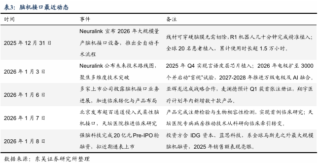 近期,脑机接口行业海内外共振,国际巨头加速技术迭代与量产落地,国内政策、资本、企业协同发力推进产业化进程。国际端,Neuralink以技术迭代与量产规划引领行业方向,从全自动手术流程落地到中长期技术路线图公布,持续推动侵入式脑机接口向规模化应用迈进。国内端,,强脑科技完成20亿元Pre-IPO轮融资,拟近期递表上市,系全球马斯克neuralink外最大规模的脑机融资。