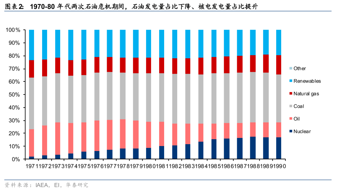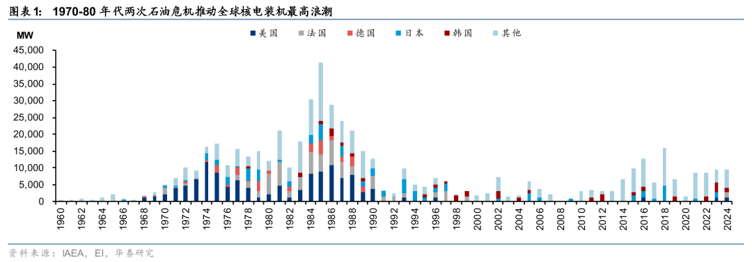 全球第一轮核电装机浪潮始于两次石油危机,推动核电从军用转向民用。全球西方国家的在运核电装机,超过8成是在1973-1980年的两次石油危机期间审批、建设、投产的。全球民用核电技术起步于1954年前苏联5兆瓦实验性石墨沸水堆型核电站,此后在1960年代西方国家的核电原型堆、第一代示范电站密集验证,推动了1970年代第二代民用核电装机的黄金发展期。1973年石油危机爆发以前,全球电源结构中超过24.8%依赖石油发电,前三大电源依次为煤电(38.2%)、石油发电、可再生能源(包含水电,合计21.6%)。第一次石油危机的爆发进一步推动了美国、法国、日本等西方国家出台加速民用核电装机的政策,包括美国尼克松政府1973年推出的“Project Independence”核电视作应对OAPE石油禁运的核心举措之一、法国梅斯梅尔总理1974年推出的“Messmer计划”宣布核电是法国伟大机会、日本在1973年第一时间将核电定位为“国家战略优先”。从1973~74年起,核电站建设再度大幅提速,结合核电站建设周期,在1980年代推动了核电站投产的第二波高峰。1970-80年间,全球年均新增核电装机16GW,单年最高投产达到42GW,到1990年,全球核电发电占比从1973年的3.3%提升到16.7%,跃升成为全球第三大电源(前两大依次为煤电37.4%、可再生能源19.7%),基本填补了石油发电占比下降带来的空缺。