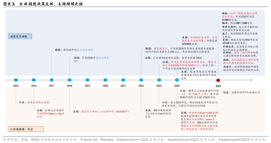 三里岛、切尔诺贝利、福岛核事故导致全球核电三十余年低谷,2022年俄乌冲突标志着全球核电政策第二波复兴浪潮的开启。1979年三里岛事故、1986年切尔诺贝利事故、2011年福岛核事故的接连发生,叠加全球电力需求增速的放缓,各国核能政策纷纷转向,核电项目建设的长周期使得1980年代全球核电新增装机保持韧性,但从1991年开始新建规模大幅滑坡,1990-2021年全球年均净新增核电装机回落至1.4GW,缩水至1970-80年代的高峰的十分之一。2022年俄乌冲突引发欧洲能源危机,俄罗斯天然气供应骤减再次将核电推上“能源安全”核心位置,成为全球核能政策从“退潮”到“复兴”的分水岭。2022年起,法国、韩国、比利时、德国的退核政策纷纷扭转,日本核电站重启审批加速,美国推出补贴政策助推存量核电站延寿,并牵头联合22国签订了近年来最重磅的全球核电装机增长承诺---COP28大会上的《2050年三倍核宣言》,共同推进2050年将全球核能容量较2020年增加两倍、达到约1100~1200GW装机量(截止2026年初,加入宣言的国家已达38个)。