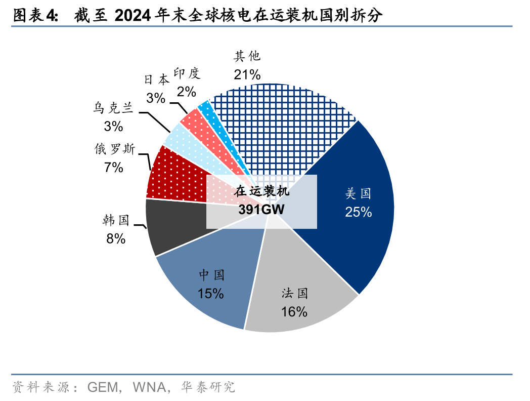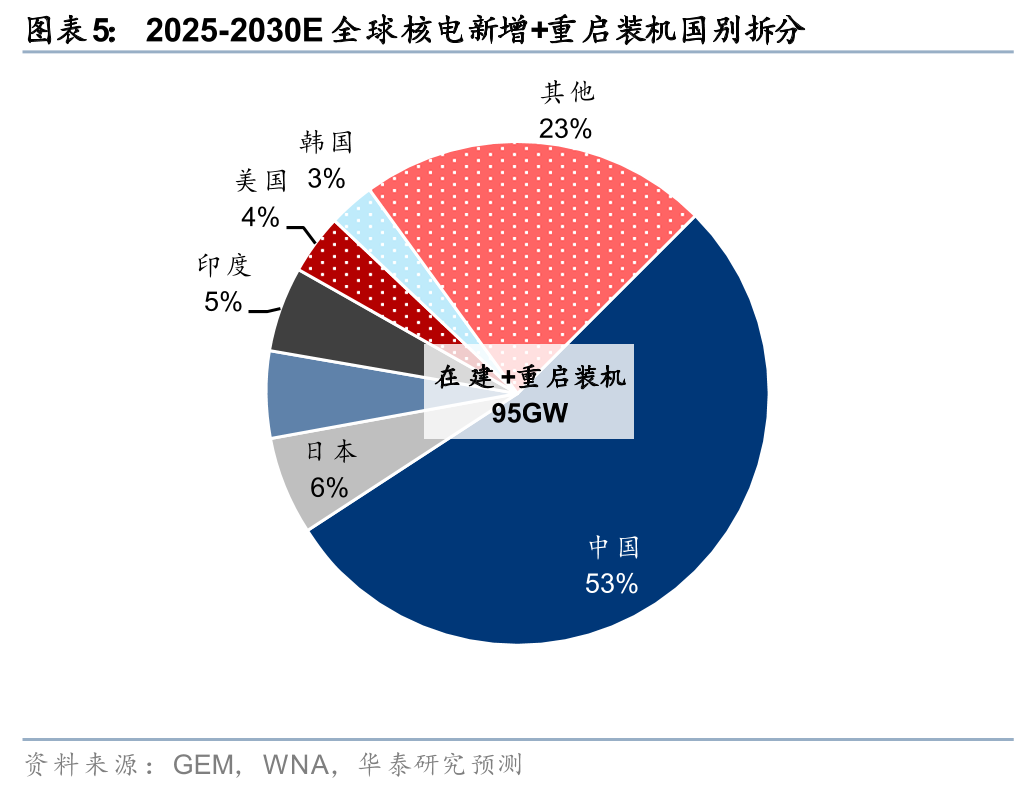 本轮美伊冲突下,多个核电大国的能源供给冲击或首当其冲,全球核电政策加码 新增装机加速有望再上一层楼。与气电所用的天然气燃料相比,核电天然铀具备“高库存、低消耗”的燃料特性,在能源供给扰动风暴中其优势有望得到凸显。截止2024年,我们自下而上统计全球核电装机391GW,基准情形下我们预测2025-30年间全球核电新增装机95GW,到2030年全球核电装机有望达到486GW,2024-30年复合增速3.7%。新增装机中,包括82GW以中国、俄罗斯、印度为首的新建核电站投产,以及13GW来自美国和日本已规划的核电站重启;而在美伊冲突带动的气电、煤电供给紧张/成本增加的蝴蝶效应下,不排除日本、德国、中国台湾在短中期内退役但仍具备重启条件的核电站进一步重启带来的额外增量(我们估算额外的潜力分别9~18GW、4GW、2GW),合计15~24GW,相当于在运装机的3.8~6.1%。当前,全球核电装机中法国、日本、韩国等占比达到27%,美伊冲突下的电力供给冲击或有望推动这些国家核电支持政策的加速落地,推动2030年后全球核电装机增长能见度的持续拉长。近期,在3月12日法国巴黎第二届核能峰会,中国正式加入全球《三倍核能宣言》,以支持到2050年实现全球核电装机容量较当前基础上至少扩大三倍,至此加入该宣言的国家数量增至38个,也进一步强化了行业2030年后的增长前景,推动核能上行周期的久期拉长。
