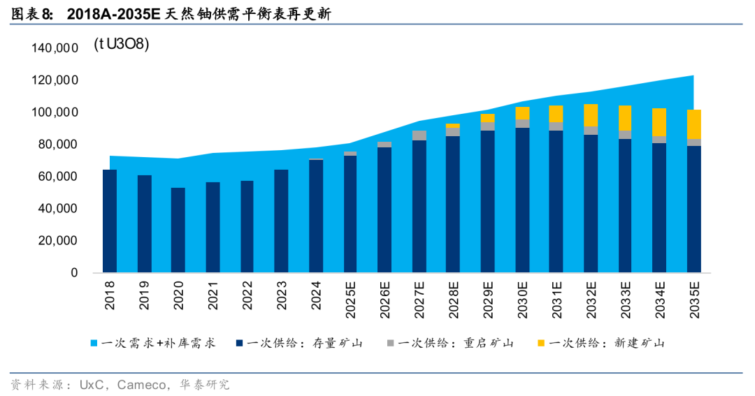 2. 印度:2026年3月2日,Cameco与印度政府原子能部达成长协,将在2027~2035年间向印度供应合计2200万磅U3O8(对应约1万吨U3O8),对应平均每年约1100t U3O8需求。在此之前,印度政府原子能部刚刚于2026年2月20日与哈原工达成重大天然铀交易,交易规模超过哈原工资产账面总价值的50%,虽然交付规模和价格因印方保密需求尚未公开,我们测算印度与哈原工签约规模量或与Cameco长协相当。截止2025年,印度在运核电装机24座/8.8GW,我们测算对应年天然铀消耗量约1760吨U3O8;在建核电装机6.6GW,相当于在运装机的75%,预计于2029-30年落地。基于此,我们估算此次印度接连签署的两份长协采购量或能覆盖印度在运 在建核电站2027-35年之间的天然铀需求,侧面体现出印度方面在全球天然铀供需预期持续收紧的趋势下,实现天然铀供应安全的迫切诉求,且考虑到印度政府于2025提出了2047 年实现 100 GW的装机容量目标,后续的天然铀需求或将更为旺盛。而这也意味着短中期内,剩余可供西方低库存、高需求核能大国采购的天然铀供应正在逐步枯竭。