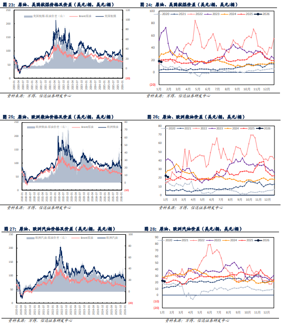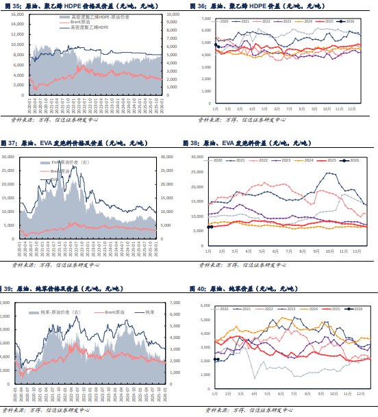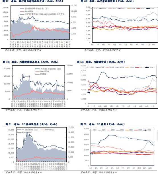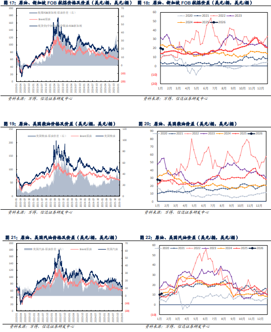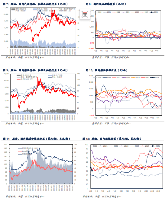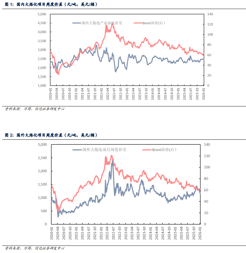 自2020年1月4日至2026年1月9日,布伦特周均原油价格涨幅为-8.71%,我们根据设计方案,以即期市场价格对国内和国外重点大炼化项目做价差跟踪,国内重点大炼化项目周均价差涨跌幅为 7.91%,国外重点大炼化项目周均价差涨跌幅为 22.40%。
