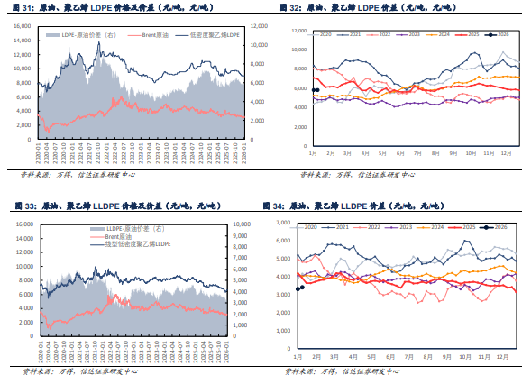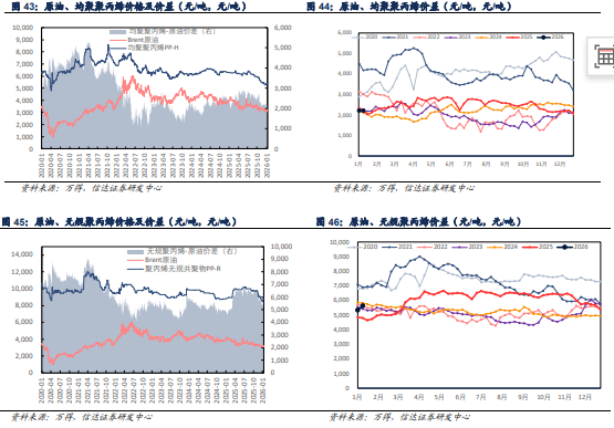 聚丙烯:本周聚丙烯检修装置数量增多,供应端压力下滑,产品价格、价差整体上行。本周均聚聚丙烯、无规聚丙烯、抗冲聚丙烯均价分别为5371.78( 8.01)、8785.71( 285.71)、6650.00( 0.00)元/吨,与原油价差分别为2214.68( 3.97)、5628.62( 281.68)、3492.90(-4.04)元/吨。
