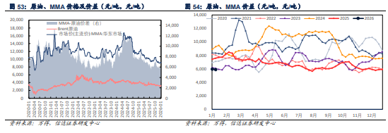 MMA:产品价格价差小幅下跌。本周MMA均价9064.29(-75.00)元/吨,MMA -原油价差5907.19(-79.04)元/吨。