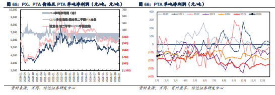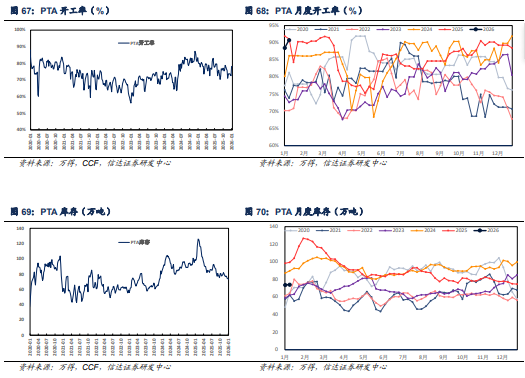 PTA:产品价格小幅下跌。目前PTA现货周均价格在5067.86(-12.14)元/吨,行业平均单吨净利润在-135.90( 8.49)元/吨,开工率78.20%( 0.10pct) ,PTA社会流通库存至73.92( 0.37)万吨。