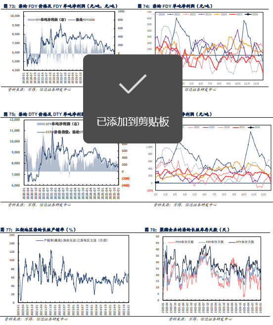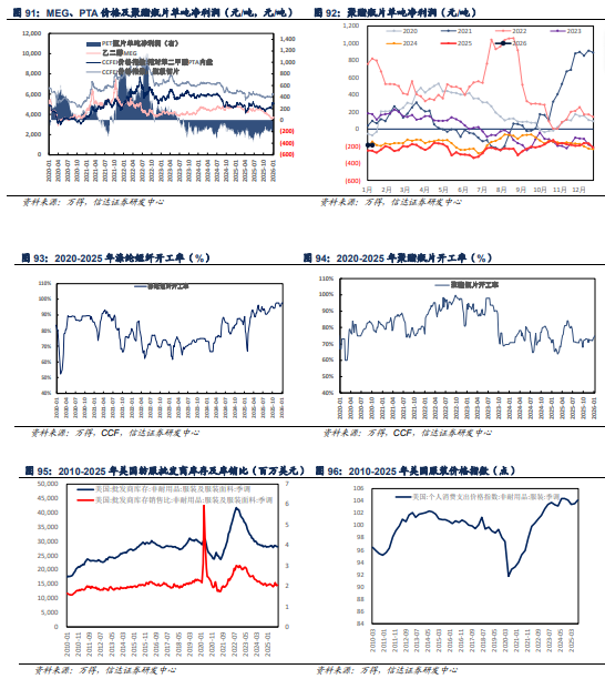 【聚酯&锦纶板块】本周聚酯、锦纶产业链价格偏稳运行。聚酯方面,本周下游PTA行业开工水平虽有提升,不过聚酯行业春节期间检修装置较多,PX商品整体表现降温。MEG价格偏稳运行。PTA产品价格小幅下跌。涤纶长丝终端需求持续萎缩,纺织市场新增订单寥寥,纺织企业库存水平不断累积以及年末资金压力下,清库回款情绪愈发浓厚,产品价格偏稳运行,库存有所上涨。短纤及瓶片价格小幅下跌。锦纶方面,本周锦纶长丝价格持稳运行,价差小幅修复。