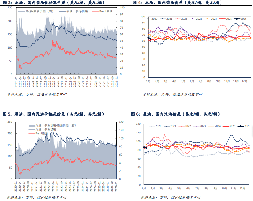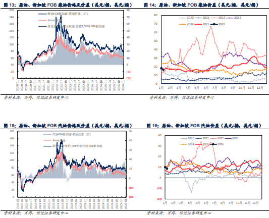 【炼油板块】周前期,美国对委内瑞拉采取军事行动,且当前美国对委内瑞莱制裁仍然有效,但委内瑞拉局势难改全球石油供应过剩的大背景,市场理性评估委内瑞拉局势对整体供应影响,加之美国已达成一项进口委内瑞拉石油的协议,委内瑞拉将向美国移交数千万桶原油,加剧供应过剩担忧,国际油价下跌。周后期,市场评估委内瑞拉局势发展,特朗普对伊朗进行威胁,俄乌冲突持续且加剧,市场对俄罗斯、伊朗供应担忧,国际油价反弹上涨。2026年1月9日布伦特、WTI原油价格分别为63.34、59.12美元/桶,较2026年1月2日分别 2.59、 1.80美元/桶。成品油方面,国内外成品油价格价差普跌。