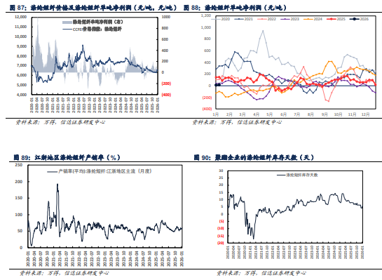 涤纶长丝:成本端,本周成本端支撑偏弱。供给端,本周供给端无明显变化。需求端,本周终端需求持续萎缩,纺织市场新增订单寥寥,纺织企业库存水平不断累积以及年末资金压力下,清库回款情绪愈发浓厚,产品价格偏稳运行,库存有所上涨。目前涤纶长丝周均价格POY 6550.00( 0.00)元/吨、FDY6800.00( 0.00)元/吨和DTY 7750.00( 0.00)元/吨,行业平均单吨盈利分别为POY-106.38( 6.93)元/吨、FDY-239.13( 6.93)元/吨和DTY 26.36( 6.93)元/吨,涤纶长丝企业库存天数分别为POY11.70( 1.10)天、FDY19.50( 1.40)天和DTY 24.60( 2.70)天,开工率90.20%( 0.70pct)。