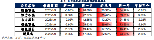 6大炼化公司涨跌幅:截止2026年1月9日,6家民营大炼化公司近一周股价涨跌幅为荣盛石化(-0.85%)、恒力石化( 3.06%)、东方盛虹(-2.02%)、恒逸石化(-2.60%)、桐昆股份( 2.67%)、新凤鸣( 2.36%)。近一月涨跌幅为荣盛石化( 20.06%)、恒力石化( 22.27%)、东方盛虹( 12.55%)、恒逸石化( 25.63%)、桐昆股份( 19.47%)、新凤鸣( 17.25%)。