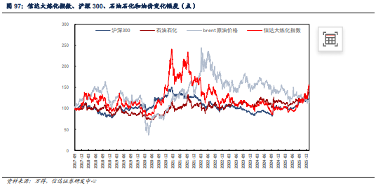 自2017年9月4日至2026年1月9日,信达大炼化指数涨幅为 81.32%,石油石化行业指数涨幅为 38.72%,沪深300指数涨幅为 23.75%,brent原油价格涨幅为 21.02%。我们以首篇大炼化行业报告《与国起航,石化供给侧结构性改革下的大道红利》的发布日(2017年9月4日)为基期,以100为基点,以恒力石化、恒逸石化、荣盛石化、桐昆股份、新凤鸣和东方盛虹6家民营炼化公司作为成份股,将其股价算数平均后作为指数编制依据。