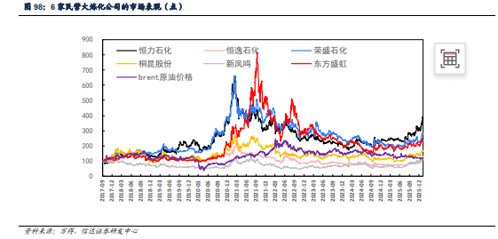 截止2026年1月9日,6家民营大炼化公司近一周股价涨跌幅为荣盛石化(-0.85%)、恒力石化( 3.06%)、东方盛虹(-2.02%)、恒逸石化(-2.60%)、桐昆股份( 2.67%)、新凤鸣( 2.36%)。