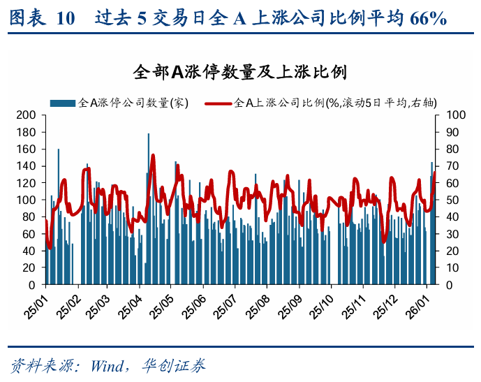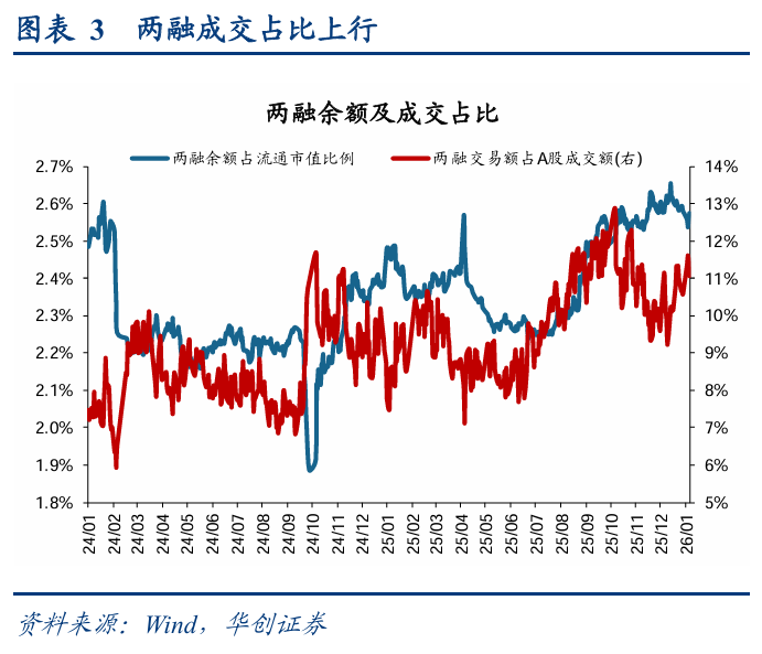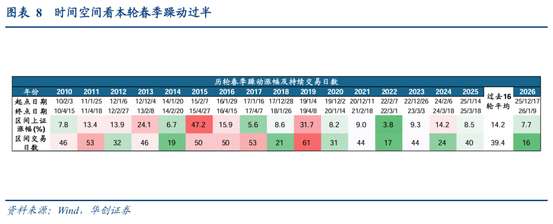 本轮春季躁动行情过半,十六连阳下的时间空间均有半成余量,交易未极端过热。结合历史春季躁动的节奏来看本轮行情在涨幅和持续天数上或仍有空间,我们统计2010年以来的各轮春季躁动,相对过去16轮躁动中上证平均涨幅14.2%、持续交易日数39天,当前上证涨幅7.7%、持续16日依然存在约半成余量。同时根据我们在《A股十四连阳,躁动几成热?》中的讨论,从四个视角衡量当前十六连阳下的交易指标并未极端过热:①截至1/9全A成交额3.15万亿、换手率2.4%,较8月底峰值3.2万亿/2.8%仍存空间,且8月底峰值水平并不代表该值一定为本轮牛市峰值;②申万一级行业滚动半年涨跌幅前5均值-后5均值达62%,较10月初69%,当前行业分化未达到极端水平;③以“近4周成交额占全A比例/自由流通市值占全A比例”衡量热门主题赛道交易热度,其中仅商业航天/卫星导航/核聚变/航母成交热度居历史高点,相比之下脑机接口(当前成交热度分位71%,下同)、机器人53%、保险49%、稀有金属44%、AI应用39%、半导体设备17%等仍处历史中低位;④前述我们提到两融为主要增量资金,成交占比虽已上升至11%,但较前期10/9高点的13%仍存差距。