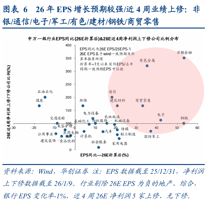 本轮科技“小登”的活跃主要由于短线增量资金在具备增长基础的方向中寻找估值弹性,而非推升存量资金已抱团的“老登”科技。科技内部的“老登”“小登”分歧主要在于增量资金,“老登”科技已普遍形成存量资金的抱团,共识度高。从增量资金结构看,本轮行情的启动主要由A500 ETF大幅流入推动,随后蔓延至两融、小单及私募资金的放量,资金属性整体偏短、偏交易:从两融交易额占全A成交额来看,已由12/12的9%上升至1/8的11%;小单(挂单额小于4万元)净流入额上,12/01-12/05单周流入958亿元,本周净流入达1557亿元;私募备案规模上看,25下半年同样持续放量,已从6月501亿元放大至11月的713亿元。由于加杠杆后的资金成本较高,此类资金更偏好具备高弹性和主题想象空间的方向。商业航天、脑机接口等新主题之所以受到关注,本质并非单纯概念炒作,而是在军工(26年EPS同比37%,下同)、机械(19%)等本身26年具备较高增长预期,通过引入新的产业叙事来实现估值再定价。当前若为了寻找还能在预期增长上拔估值的行业,我们认为该行业须同时具备26年较高的预期增长及近期业绩的动态上修,具体而言我们关注以下两个角度:①EPS同比,即26年EPS预期相对25年EPS增长预期较强,其中由于EPS的wind一致预期通常较为乐观,我们根据7月以来实际EPS/去年同期一致预期EPS的中位数对26E EPS进行折算;②近四周26E净利润上修/下修公司比例较高,基于此我们归纳出26年业绩预期较强且近期业绩动态上修的行业包括非银、通信/电子、军工、有色/建材/钢铁、商贸零售。