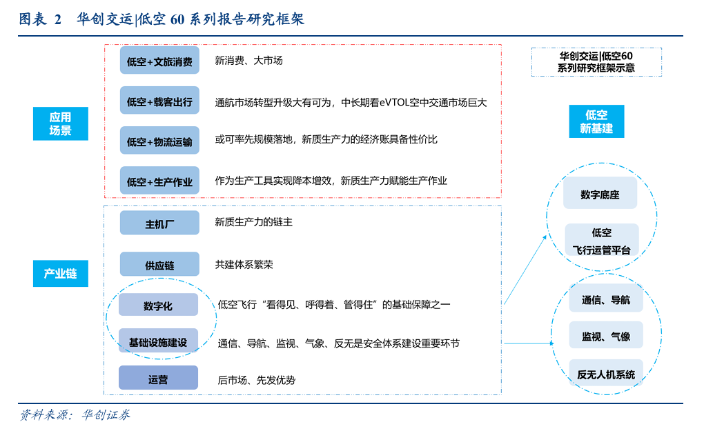 由此我们将华创交运|低空60系列报告的研究框架更新为:四大应用场景 两大低空新基建 五大产业链环节。