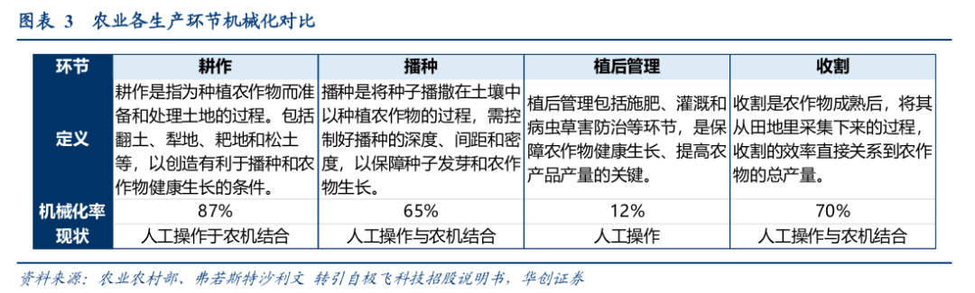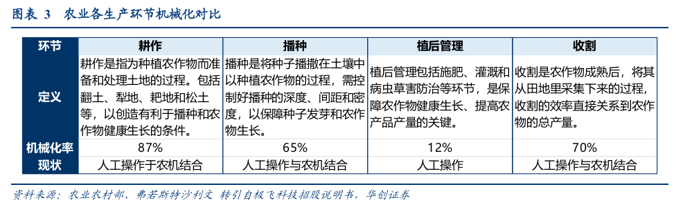 1、农业生产作业环节中,植后管理的机械化率仅12%,显著低于其他