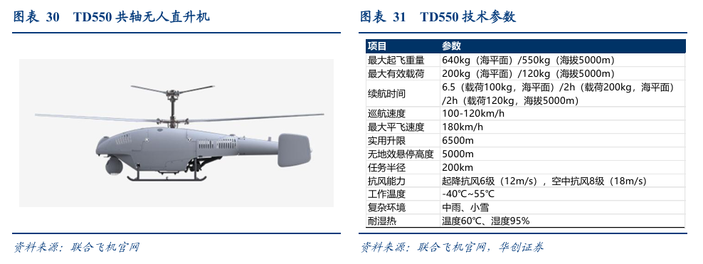 1)TD550:可在高海拔地区起降的高原、高速、大载重无人直升机。最大有效载重200kg,满载续航2h。