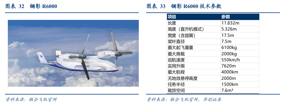 2)镧影R6000:联合飞机自主研制的六吨级倾转旋翼飞行器,550km/h巡航速度,最大航程4000km,载重2吨。