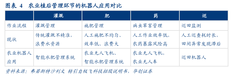 其引用农业农村部数据及弗若斯特沙利文报告:2024年,中国农业整体机械化率约75%,但耕、种、管、收四个环节的农业机械化率分别约为87%,65%,12%和70%,植后管理环节机械化程度远远低于其他环节,说明传统农业机械难以满足该环节特有的高精度作业需要。分析其原因或在于:植后管理的关键组成部分包括施肥、灌溉和病虫草害等需多次重复作业,尤其在农作物生长旺季,传统模式下依赖大量人工。