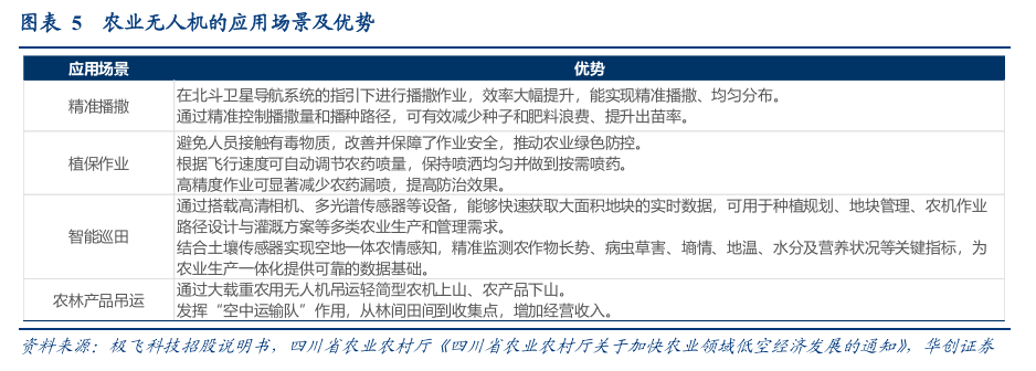 根据2025年4月,《四川省农业农村厅关于加快农业领域低空经济发展的通知》:打造“农用无人机 ”5类典型应用场景:植保作业、精准施肥、播种、农情监测及农林产品吊运等,以构建高效的空地协同农业生产体系。