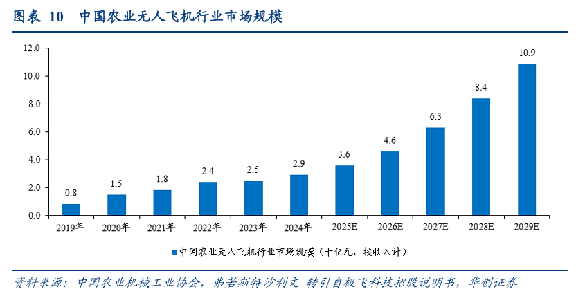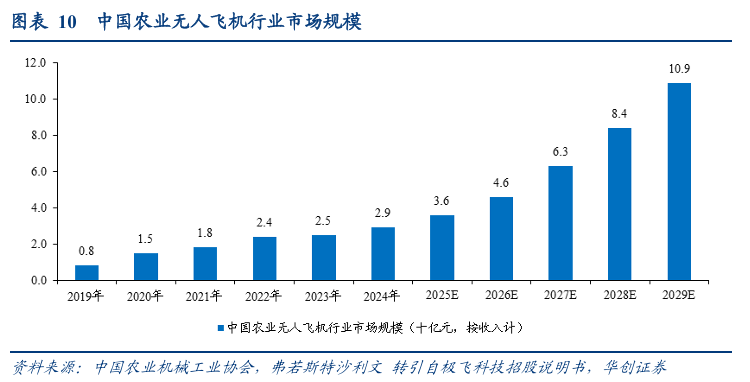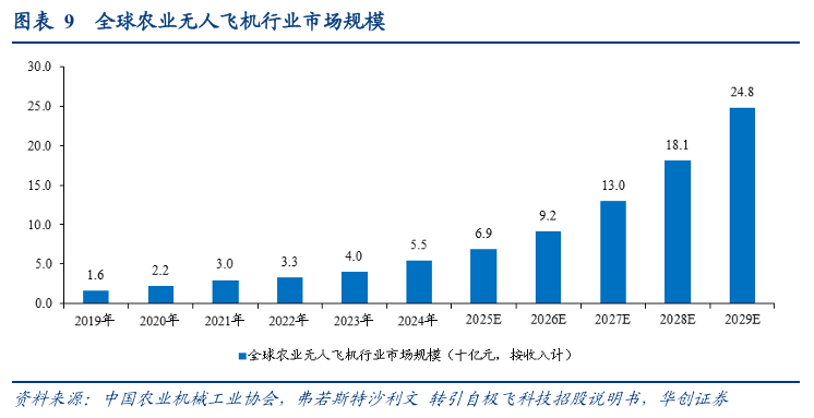 b)市场处于快速增长期。2024年,全球农业无人机市场规模55亿,我国市场规模29亿,预计到2029年均以超30%的复合增速实现增长,分别达到248亿及109亿。而飞防服务市场规模或超百亿。