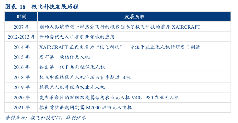 根据极飞科技公司招股书介绍,2007年,公司创始人彭斌先生创办极飞科技的前身XAircraft团队,2012年4月XAircraft成立为有限公司,并于2014年正式更名为“极飞科技”。2021年3月,公司改制为股份有限公司。2014-2023年间,极飞科技先后完成A轮到C 轮共7轮融资。经过18年在农业机器人研发、销售等领域的深耕,公司于2024年获工业和信息化部认定为国家级制造业单项冠军企业,2025年获工业和信息化部认定为重点小巨人企业。