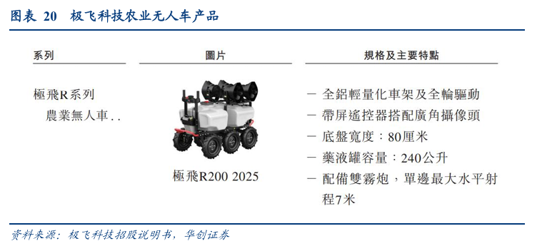 极飞科技研发农业无人车满足经济作物种植场景(如果园、温室)中的多样化农耕需求,适配不同地形条件。农业无人车具备多种功能,包括精准喷洒农药及农资运输等。