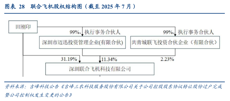 实控人为田刚印,田刚印及其控制的深圳市迈迅投资管理企业(有限合伙)、共青城联飞投资合伙企业(有限合伙)合计持有深圳联合飞机科技有限公司约45%股权。