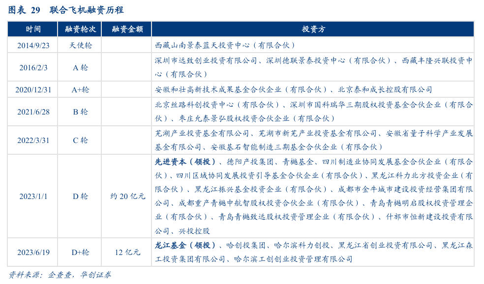 其发展历程看:2012年北京中航智科技有限公司成立,2014年,深圳联合飞机科技有限公司成立,开始了无人机的全线研发打造。2021年,成立芜湖联合飞机科技有限公司,规划建成“一院四基地”新一代航空器研究院、生产制造基地、试验试飞基地、售后培训基地。同年,联合飞机在成都市金牛区与德阳什邡市建设倾转旋翼无人机总体研发生产项目。