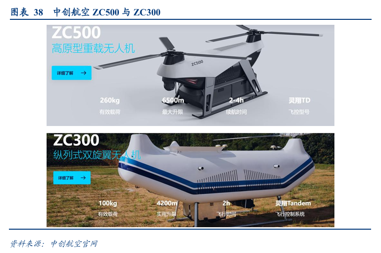 其中:ZC500无人直升机纵列式双旋翼结构,纵向重心范围大,最大起飞重量 650 kg,最大载荷260 kg,最大飞行高度6500米,最大速度160千米/小时,抗风能力强。