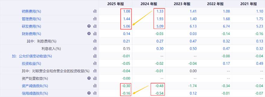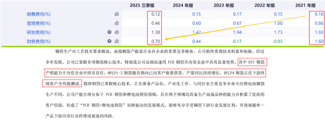 铜冠走的更像是一条资源型企业的转型之路。作为安徽省国资委控股的企业,铜冠最大的护城河在于其控股股东铜陵有色提供的稳定铜供应,这在铜价剧烈波动时构成了独特的成本优势。2025年前三季度的扭亏为盈,主要得益于PCB铜箔中RTF(反转处理)和HVLP等高端品种占比的提升,以及锂电池铜箔极薄化产品的逐步上量。同时,公司期间费用率由2021年的4.55%降至2.66%的极低水平,作为国企来讲实为不易,也能显示出公司在成本控制上的决心。