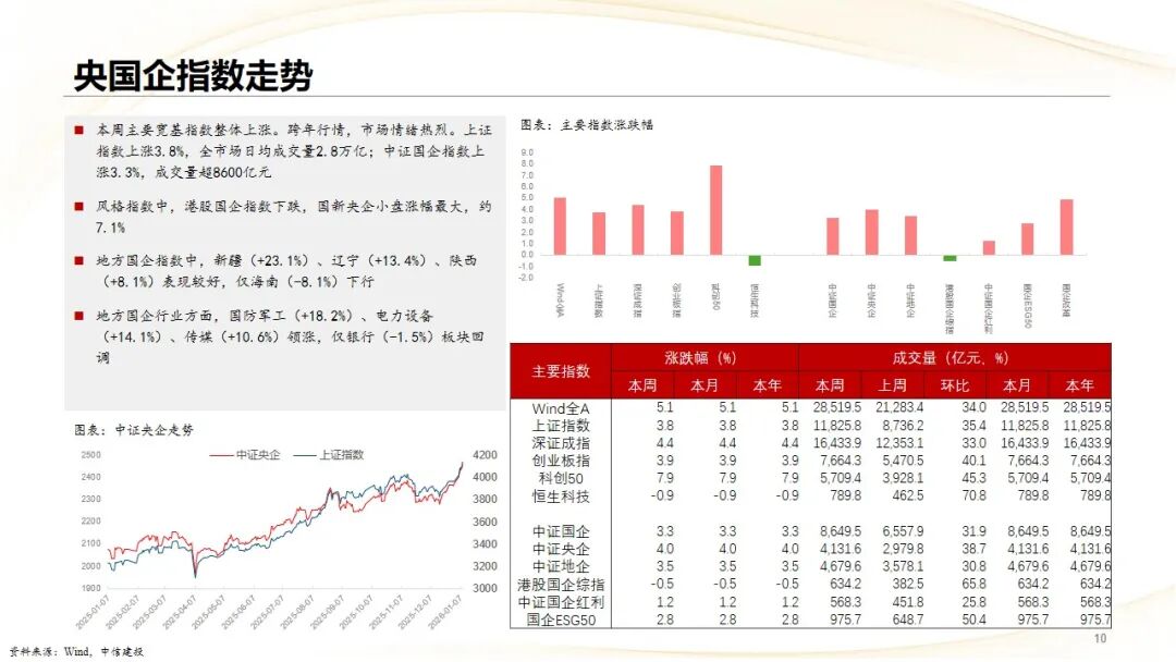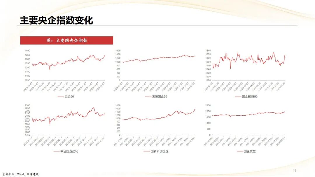 央国企相关指数表现分化:中证国企指数上涨 3.3%,成交量超 8600 亿元;中证央企指数上涨 4.0%,,中证地企指数上涨 3.5%,港股国企综指则下跌 0.5%。风格指数中,国新央企小盘涨幅最大,约 7.1%;主题指数方面,国企 ESG50 上涨 2.8%,中证国企红利上涨 1.2%