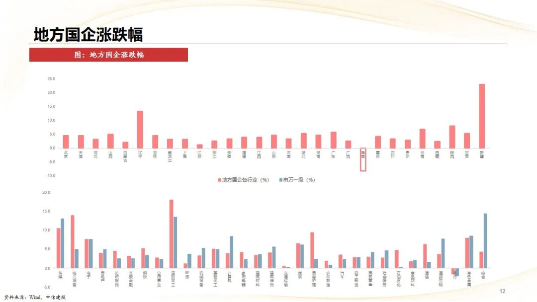 地方国企指数区域分化明显:新疆( 23.1%)、辽宁( 13.4%)、陕西( 8.1%)表现突出,成为涨幅前三的区域;仅海南(-8.1%)出现明显下行;地方国企领涨板块集中在国防军工( 18.2%)、电力设备( 14.1%)、传媒( 10.6%)等板块也表现活跃;仅银行板块出现回调(-1.5%)