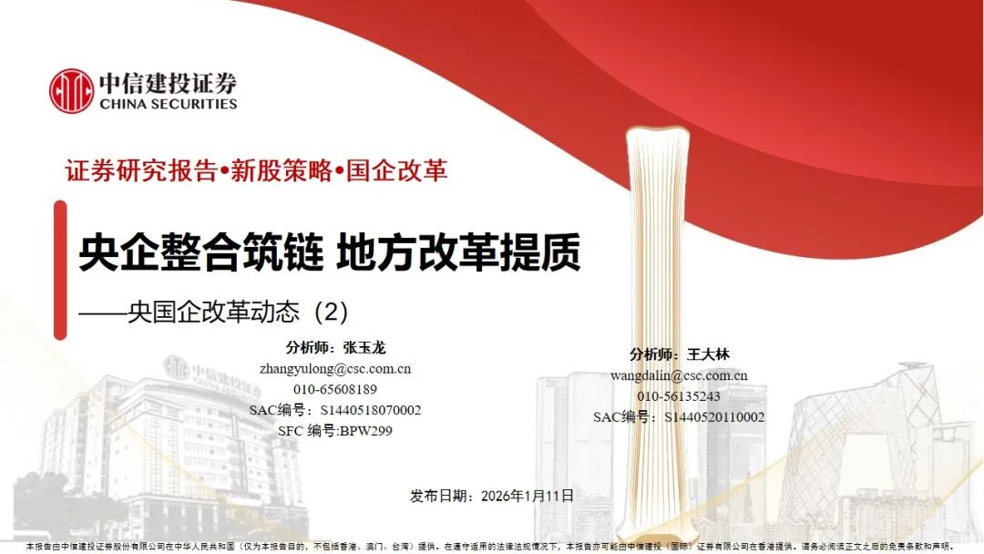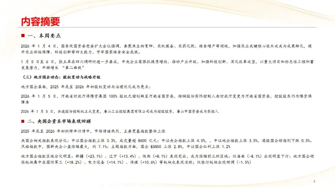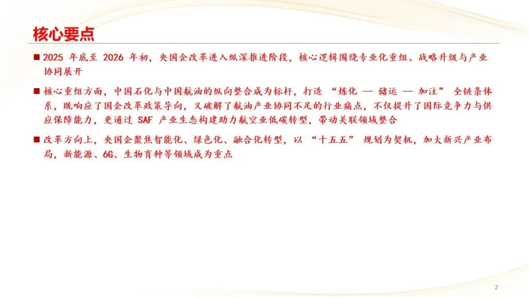 2025 年底至 2026 年初,我国国资国企改革进入深化提升阶段,战略性、专业化重组整合成为核心主线,央国企在产业链优化、布局升级等方面动作提速