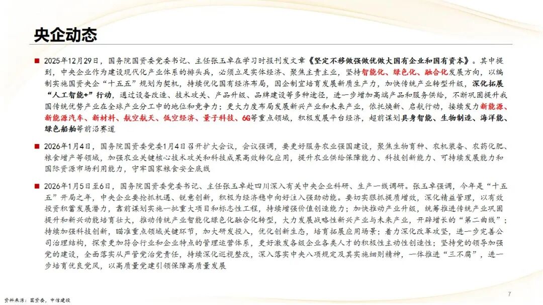 2025 年 12 月 29 日,国务院国资委党委书记、主任张玉卓在《坚定不移做强做优做大国有企业和国有资本》一文中明确,中央企业需立足实体经济、聚焦主责主业,坚持智能化、绿色化、融合化发展方向。以 “十五五” 规划编制实施为契机,央企将持续优化国有经济布局,培育新质生产力,加快传统产业转型升级,深化 “人工智能 ” 行动,增加高端产品和服务供给;更大力度布局新能源、新能源汽车、新材料、航空航天、低空经济、量子科技、6G 等重点新兴产业,超前谋划具身智能、生物制造等前沿赛道